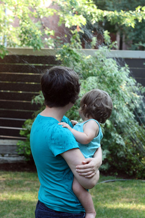 dad had fun sweeping her right through the sprinklers then running before they came back.